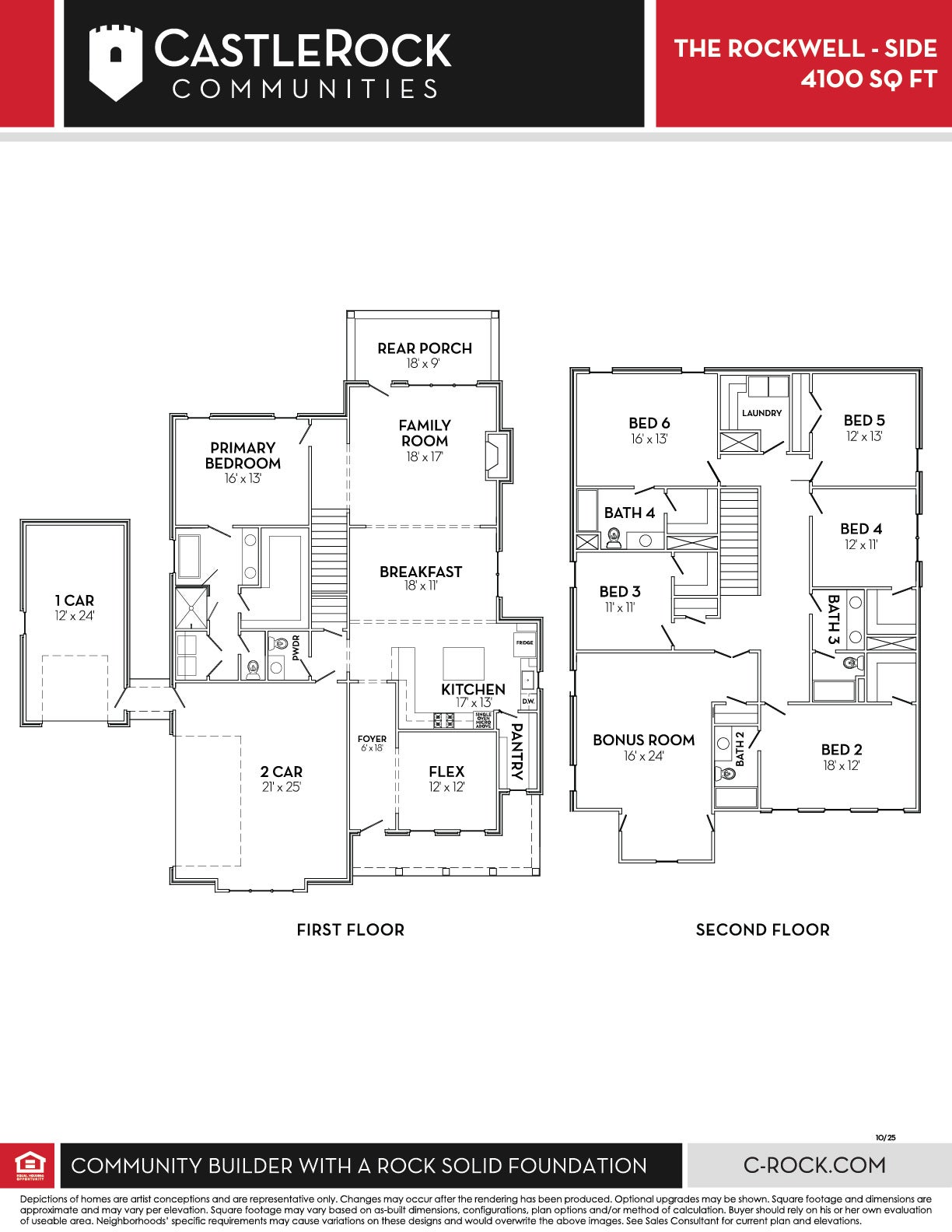 Experience the ultimate in space and luxury with this impressive 4,100 square foot home. With six bedrooms and four full bathrooms—plus a convenient first-floor powder room—this floor plan is perfect for those who love to host guests or growing families. The heart of the home is an open-concept kitchen, dining, and family room that creates a seamless flow for everyday living and special occasions. Imagine preparing meals in a chef-inspired kitchen while staying connected to family and guests in the spacious living area. Step outside to the rear porch for fresh air and relaxed outdoor gatherings. The main level features a private primary suite designed as your personal retreat. Enjoy a spa-like bath with dual vanities, a separate tub and shower, and a generous walk-in closet. Upstairs, five additional bedrooms provide plenty of space, along with three full bathrooms for convenience. An upstairs bonus room offers endless possibilities—think media lounge, playroom, or home office—while the laundry room on the second floor makes chores a breeze. A three-car garage adds practicality and storage for vehicles, hobbies, and more. From its spacious layout to its thoughtful details, this home invites you to imagine life here: cozy evenings in the family room, lively weekend gatherings on the porch, and quiet mornings in your luxurious suite. With so much to explore, this floor plan is more than a home—it’s a lifestyle waiting for you. Build your dream home with CastleRock today.