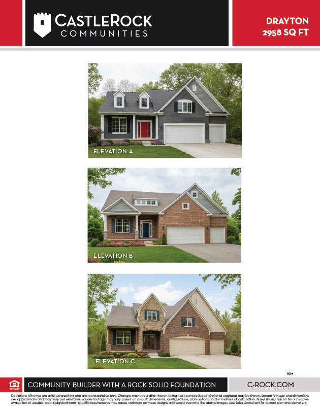 The Drayton floor plan combines elegance and functionality designed to fit most lifestyles. With four spacious bedrooms and two and a half bathrooms, this stunning home offers an open-concept layout that’s practical and comfortable. Step inside and be greeted by the two-story foyer that leads you directly to the formal dining room, where you can host many memorable dinners and special celebrations. Need a space for studying or working? Swap the formal dining for a study instead! Down the hall is the spacious great room, where you can entertain with style with its soaring ceilings, natural light, and optional fireplace to create a warm and inviting atmosphere for gatherings of any size. The breakfast nook and kitchen are designed for both convenience and style. Gorgeous countertops, industry-leading appliances, and an island make meal preparation a delight, with an adjacent breakfast nook. The Drayton offers several different options available when it comes to creating your dream kitchen. At the end of the day, retreat to the grand master suite, complete with a private ensuite bathroom with dual vanities, a separate tub and shower, and a walk-in closet. If you like, you have the option of separating the vanities, adding a 5-ft shower, or adding a tile tub deck – the choice is yours! A flexible bonus room awaits upstairs, offering an optional vaulted ceiling with endless possibilities for customization as a media room, playroom, or whatever you decide. Three more bedrooms, each with walk-in closets, reside upstairs, as well as an additional bathroom, and two walk-in storage closets. You can also include an optional Jack & Jill bathroom between bedroom #2 and bedroom #3, should you choose to do so. There are plenty of included features and attractive options inside the Drayton home. Rest assured, you will love the flexibility and comfort this home has to offer.