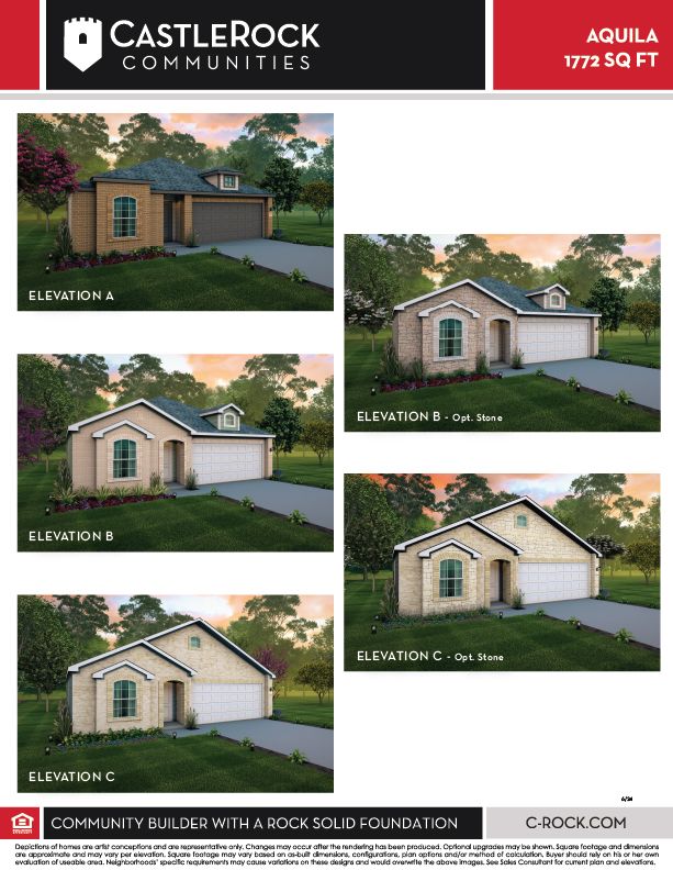 With convenience at the forefront, our Aquila floor plan will meet the lifestyle needs of most any family. Boasting 3 bedrooms and two full bathrooms, this single-story home is the perfect size for growing families or empty-nesters alike. As soon as you open the door, you are greeted by an elegant entryway that leads to the secondary and third bedrooms with the secondary bathroom in between. Down the hall, you'll pass the two-car garage. If you find yourself needing more storage space in the garage, opt for the larger garage and turn it into a 2.5-car or 3-car garage! Across from the other bedrooms resides the remote Master Bedroom. The attached Master Bathroom consists of a large vanity with cultured marble countertops and a huge walk-in closet. Looking to add an extra spark to the master bathroom? Choose to revamp your bathroom with a master luxury bath with a bathtub and separate shower, or a master super shower instead of a bathtub! The opportunities are endless. Tying the space together is the large family room with nine-foot ceilings, and the welcoming dining area the kitchen. The gorgeous kitchen includes sleek granite countertops, flat-panel countertops, and a wide kitchen island that is perfect for added counter space. You'll love entertaining your guests with the open-concept feel of the kitchen, dining room, and family room! Also, the sizable walk-in pantry will help store all of your essentials and more. Off the dining room, you will find the optional covered patio, which can be extended to fit you and your family's needs - the choice is yours. No matter what - whether you choose to keep your new home how it comes, or if you decide to add any of the options available, you will love living in your CastleRock Home. The Aquila plan is a gorgeous, flexible plan that is sure to please.