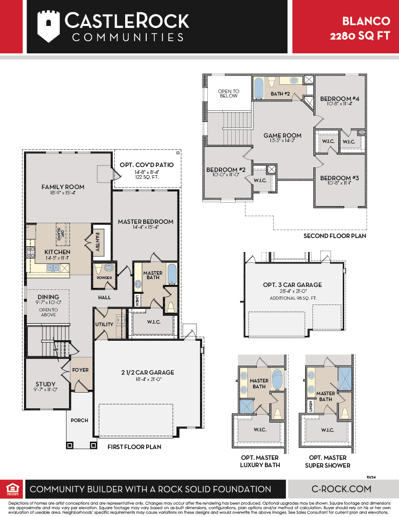 The Blanco floor plan embodies the ideal home for most any lifestyle with enough space for everyone. This home includes a two-and-a-half-car garage that serves you with the extra space you need to keep your tools, holiday decorations, or for anything else you may need to store! The entrance of the Blanco home boasts a private study room, a powder room with a white pedestal sink and decorative mirror, and an exclusive two-story dining space right down the hall. Connected to the dining space is an open-concept kitchen. The kitchen has everything you want and more - complete with sleek granite counters, ample counterspace, a large walk-in pantry, and even the option for a sizable island! You will then come across the oversized family room, perfect for gatherings with family and friends. If you are looking to embrace the great outdoors, lead the way from your family room to your optional covered patio. Your secluded Master Bedroom awaits down the hall with three windows, letting abundant natural light seep in. Attached is your master bathroom which allows for double vanities with LED down lighting, a linen shelf, a standard shower/bathtub enclosure, and a massive walk-in closet. Want to escalate the master bathroom a tad bit more? Decide to have a master bathroom super shower instead, or a luxury bath for optimal relaxation. You deserve to feel comfortable, relaxed, and at peace in your new home! Heading up the stairs, you will find three additional bedrooms, all with spacious walk-in closets, a full secondary bathroom with a shower/bathtub enclosure and a substantially-sized gameroom allowing for the ultimate game night with friends. With the Blanco floor plan, you are able to visualize your dream home and watch it come to life. As part of our most popular Cobalt product line, the Blanco is a special floor plan that will satisfy your family's wants and needs in the most convenient way. There's something in store for everyone and every lifestyle with the Blanco!