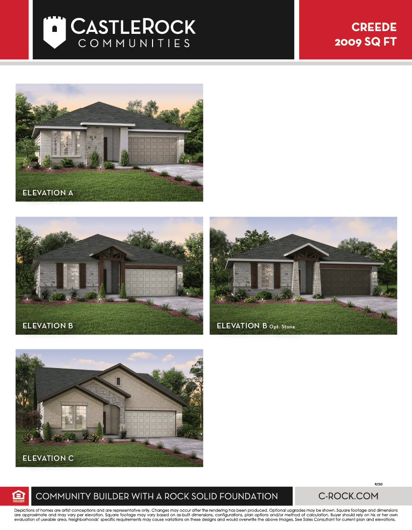 Boasting with space, the Creede plan is a highly sought-after one-story home with space for the whole family to enjoy. This three-bedroom, two-bathroom home is the perfect layout for most any lifestyle, no matter what stage of life you are in. Entering the home, you will find the long foyer leading to the second and third bedrooms, with the full secondary bathroom residing in the middle. Across the foyer lies the entry to your two-car garage. If you are yearning for more space to park a third car, or simply to store necessary items, decide to tack on an extra half-car or one-car garage! Proceed further down the hall where you will discover your walk-in utility room along with a secluded study room where you can work from home peacefully or choose to transform it into a fourth bedroom, if you are needing the extra space. Finally, at the back of the home, you are met with your combined living space. The open kitchen comes equipped with granite countertops, ample counter space, industry-leading appliances, and a pantry. It also opens up to the formal dining room and family room space, making this the perfect layout for entertaining guests. Add a stylish element to your family room by putting in an optional fireplace that will surely impress all of your family and friends. Right off the dining room, there is access to your backyard with the option to include a covered patio. Around the corner from the family room is your private master bedroom. Your refined master bathroom is complete with double vanities with LED down lighting, a bathtub and shower, and a substantially-sized walk-in closet. If you prefer a shower over a bathtub, you can opt to include a super shower in both the master bathroom or secondary bathroom instead! With plentiful included features and exclusive options available to you, the Creede floor plan is tailored to fit your lifestyle, wants, and needs the way you have always imagined. You will not ever have to sacrifice comfort with the Creede!