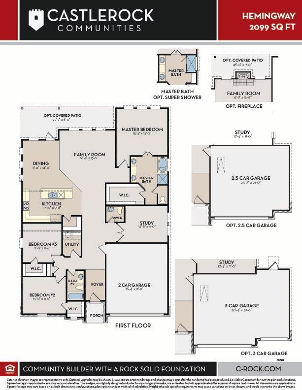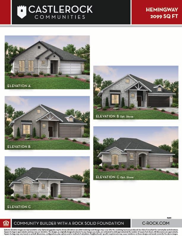 The uniquely-designed Hemingway floor plan is ideal for any lifestyle. Upon entering, the quaint foyer area greets you with your second and third bedrooms, each with walk-in closets, while your walk-in utility room and secondary full bathroom rest just beside the two bedrooms. Also at the front of the home is access to your two-car garage. If you desire more space to hold tools, supplies, or an extra car - opt for a two-and a half car garage or a three-car garage instead! Work from home in peace, or have a space for the kids to finish their homework in your private study room with a convenient powder bathroom residing just outside of the study. Next, the flow of this attractive layout will lead you directly to your spacious kitchen area that completely opens up to your welcoming dining area and family room. The unique floor plan that the Hemingway offers makes this the perfect home for quality time spent with family and friends. No matter the occasion or the gathering size, rest assured no one will miss out on the fun. Add an extra flair to your family room by opting for a stylish fireplace. Your kitchen boasts fabulous included features such as sleek granite countertops, designer light fixtures, birch cabinets, a kitchen island, and an oversized walk-in pantry! For those that love backyard barbecues with friends or neighbors, the Hemingway comes with the option for a spacious covered patio for all your guests to enjoy. When it's time to rest, head over to your secluded master bedroom just beside the family room with three windows that let the abundant natural light shine through. Your master bathroom comes complete with cultured marble countertops with dual vanities, a bathtub and a stand-alone shower. You even have the option of switching out your bathtub and stand-alone shower for a super shower, if you prefer. Explore all of the possibilities! As you can see, the Hemingway's favorable options and exclusive features take this home to the next level.