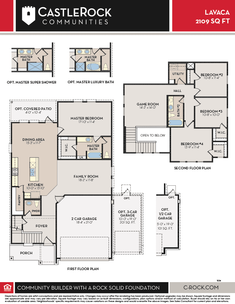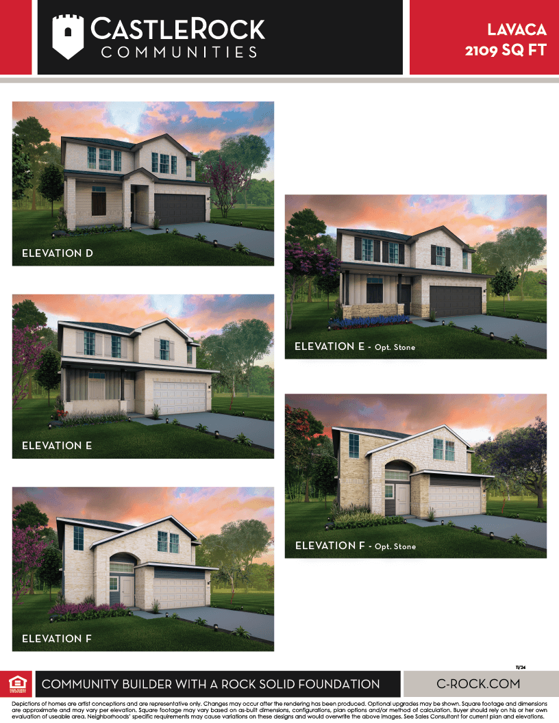 The Lavaca floor plan offers an exceptional living experience with its thoughtful design, modern amenities, and customizable options. With four bedrooms and 2.5 bathrooms, this plan provides ample space for families of all sizes. Entering this home, you're met with the foyer area which leads to the combined kitchen and dining area that faces your spacious family room area. The kitchen is complete with gorgeous granite countertops, designer light fixtures, a walk-in pantry and a sizeable kitchen island. Following the combined living area is the private master suite and walk-in closet. Homeowners can choose between a 2-car or 2.5-car garage, while the optional covered patio offers a comfortable and inviting outdoor space for relaxing and entertaining guests. For those seeking a touch of luxury, the Lavaca also includes a master luxury bath option, featuring upgraded features such as a spa-like shower, soaking tub, and double vanity. In addition, the Lavaca floor plan also boasts an upstairs game room, providing a versatile space for a variety of activities, from movie nights to game tournaments or even a home gym. Also upstairs are the three remaining bedrooms with two bedrooms containing walk-in closets for ultimate storage capacity, as well as an upstairs utility room! Measuring in at 2109 square feet, the Lavaca offers ample living space while maintaining a cozy and inviting atmosphere. With its spacious design and numerous customizable options, this floor plan truly has something for everyone. Whether you're a family looking for room to grow or a couple in need of a comfortable and stylish living space, the Lavaca floor plan is an excellent choice.