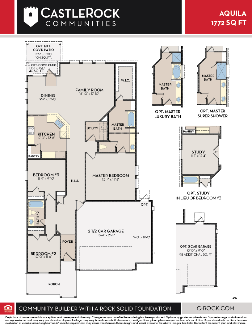 With convenience at the forefront, our Aquila floor plan will meet the lifestyle needs of most any family. Boasting 3 bedrooms and two full bathrooms, this single-story home is the perfect size for growing families or empty-nesters alike. As soon as you open the door, you are greeted by an elegant entryway that leads to the secondary and third bedrooms with the secondary bathroom in between. Down the hall, you'll pass the two-car garage. If you find yourself needing more storage space in the garage, opt for the larger garage and turn it into a 2.5-car or 3-car garage! Across from the other bedrooms resides the remote Master Bedroom. The attached Master Bathroom consists of a large vanity with cultured marble countertops and a huge walk-in closet. Looking to add an extra spark to the master bathroom? Choose to revamp your bathroom with a master luxury bath with a bathtub and separate shower, or a master super shower instead of a bathtub! The opportunities are endless. Tying the space together is the large family room with nine-foot ceilings, and the welcoming dining area the kitchen. The gorgeous kitchen includes sleek granite countertops, flat-panel countertops, and a wide kitchen island that is perfect for added counter space. You'll love entertaining your guests with the open-concept feel of the kitchen, dining room, and family room! Also, the sizable walk-in pantry will help store all of your essentials and more. Off the dining room, you will find the optional covered patio, which can be extended to fit you and your family's needs - the choice is yours. No matter what - whether you choose to keep your new home how it comes, or if you decide to add any of the options available, you will love living in your CastleRock Home. The Aquila plan is a gorgeous, flexible plan that is sure to please.