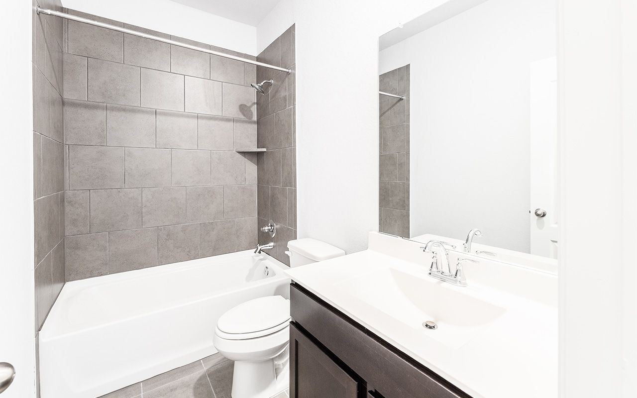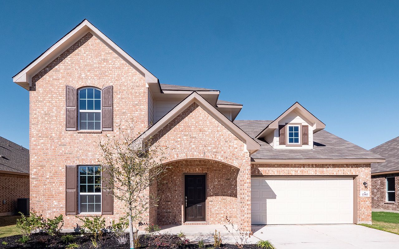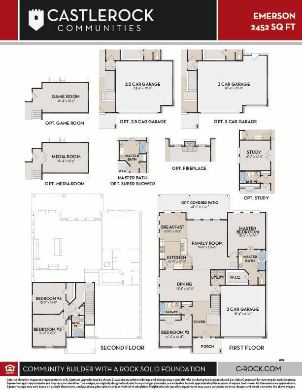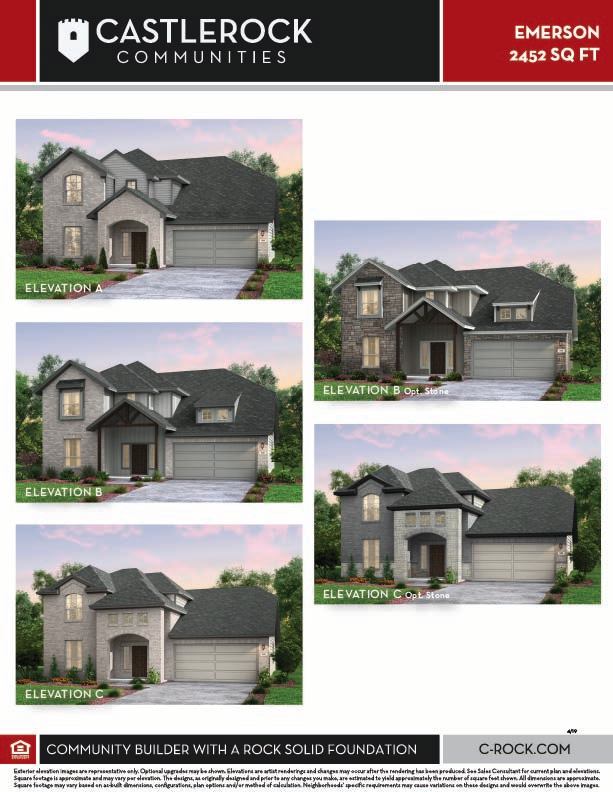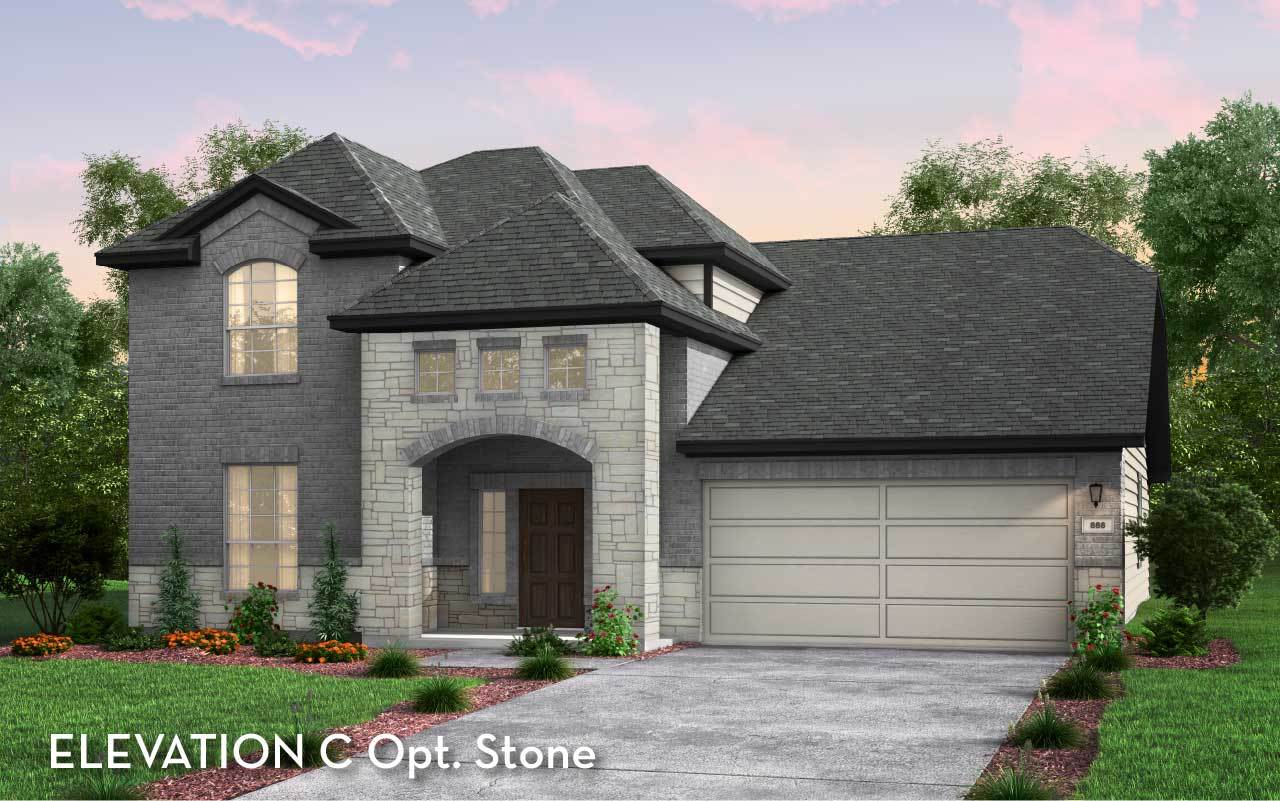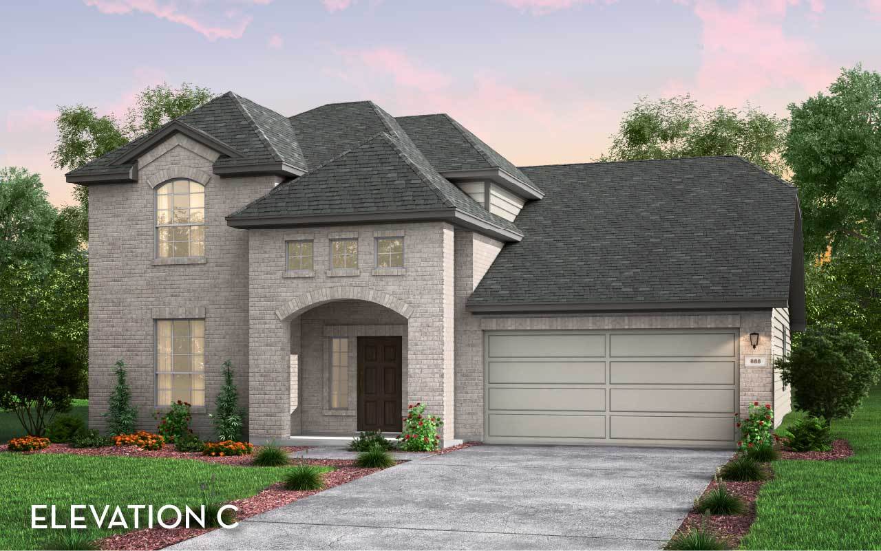 The uniquely-designed Emerson floor plan provides comfort and flexibility for the entire family. On the first floor, you are greeted by a large foyer that leads to your guest bedroom and third bathroom located just beside the bedroom. Down the hall, you are led to your welcoming formal dining room with the stairway to your second floor, a walk-in utility room, and the entry to your two-car garage just across the way. If you are needing more storage space to keep tools, supplies, holiday decorations or another car, opt to swap your two-car standard for a two-and a half or three-car garage. With the Emerson plan, you can opt to transform your dining room into a private study room if you need a home office or space for the kids to do their homework. Connected to your formal dining room is your spacious family room with the conveniently adjoined kitchen and breakfast area. Your kitchen contains several attractive features like granite countertops, birch cabinets, designer light fixtures, and industry-leading appliances. The spacious family room and formal dining room are ideal for entertaining guests. Add extra flair to your family room by choosing to put in a unique gas log fireplace. For those in your family who crave spending time outdoors, you have the option of a covered patio off the breakfast area. Finishing the first floor is your secluded master suite with three windows allowing for beautiful natural light to shine through. Your master bathroom features cultured marble countertops with dual vanities, a bathtub with a separate shower, and a sizable walk-in closet. You can even opt to upgrade to a super shower instead! Up the stairs, you are welcomed by a hallway leading to two additional bedrooms and the full secondary bathroom. Upstairs options include a game room or a media room at the top of the stairs! Either option is something your whole family can enjoy. With the Emerson plan, your family can sprawl out and live comfortably without sacrificing style.