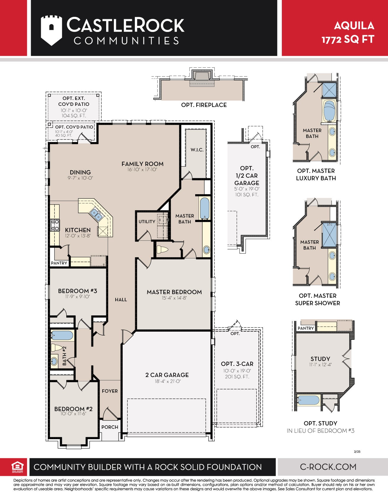 With convenience at the forefront, our Aquila floor plan will meet the lifestyle needs of most any family. Boasting 3 bedrooms and two full bathrooms, this single-story home is the perfect size for growing families or empty-nesters alike. As soon as you open the door, you are greeted by an elegant entryway that leads to the secondary and third bedrooms with the secondary bathroom in between. Down the hall, you'll pass the two-car garage. If you find yourself needing more storage space in the garage, opt for the larger garage and turn it into a 2.5-car or 3-car garage! Across from the other bedrooms resides the remote Master Bedroom. The attached Master Bathroom consists of a large vanity with cultured marble countertops and a huge walk-in closet. Looking to add an extra spark to the master bathroom? Choose to revamp your bathroom with a master luxury bath with a bathtub and separate shower, or a master super shower instead of a bathtub! The opportunities are endless. Tying the space together is the large family room with nine-foot ceilings, and the welcoming dining area the kitchen. The gorgeous kitchen includes sleek granite countertops, flat-panel countertops, and a wide kitchen island that is perfect for added counter space. You'll love entertaining your guests with the open-concept feel of the kitchen, dining room, and family room! Also, the sizable walk-in pantry will help store all of your essentials and more. Off the dining room, you will find the optional covered patio, which can be extended to fit you and your family's needs - the choice is yours. No matter what - whether you choose to keep your new home how it comes, or if you decide to add any of the options available, you will love living in your CastleRock Home. The Aquila plan is a gorgeous, flexible plan that is sure to please.